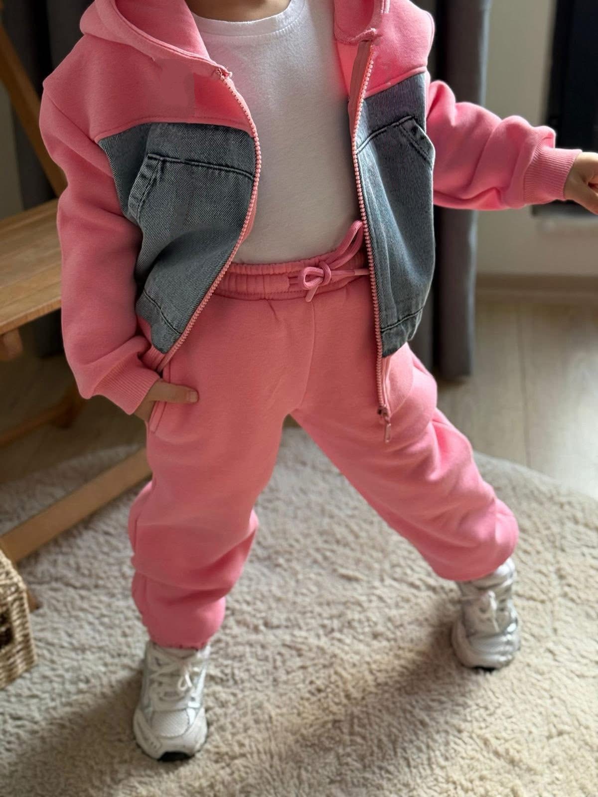 Stylová trojkombinace z vysoce kvalitního materiálu. Trojkomplet se skládá z prodloužené mikiny na zip, trička s potiskem a stylových tepláků. Mikina je na zádech zdobena potiskem. Tepláky mají boční kapsy, elastický pas a šňůrku na stažení, takže se dají pěkně přizpůsobit. Spodní část tepláků je zakončena patentkou.