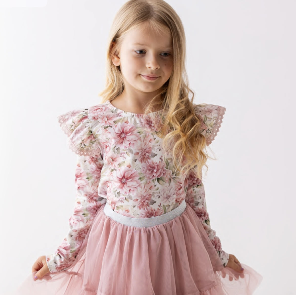 Kvalitní dívčí tričko s volánky od Lily Grey. Toto tričko je vyrobeno z vysoce kvalitní bavlny s certifikátem oeko tex. Top má dlouhé rukávy zdobené volánky s krajkou na rukávech. K tomuto topu se krásně hodí také tylové sukně od této značky.