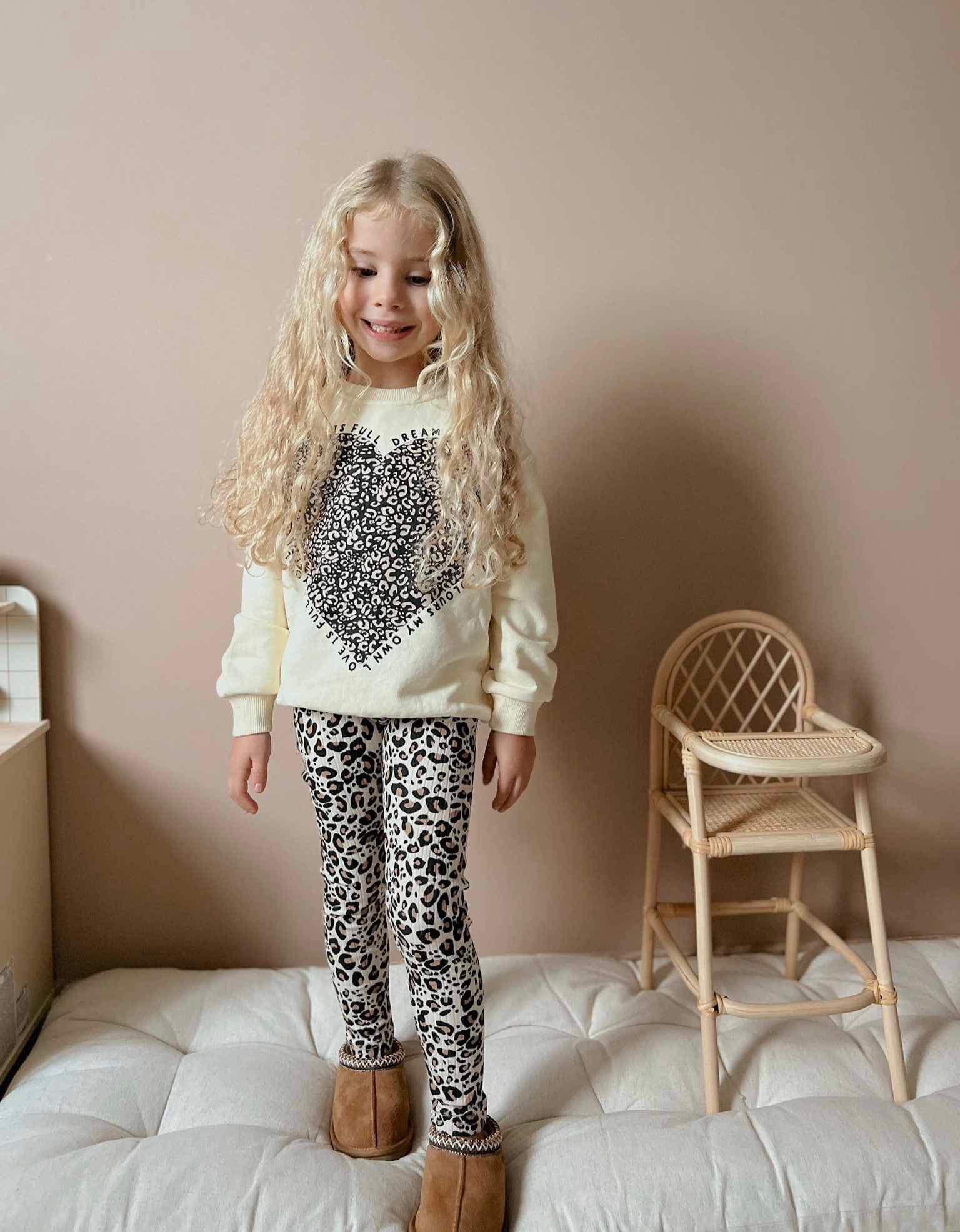 Táto očarujúca dievčenská súprava je ideálnym spojením pohodlia a rozkošného dizajnu. Vyrobená z kvalitnej bavlny, poskytuje jemnosť na dotyk a komfort pri každodennom nosení. Súprava Moly sa skladá z mikiny so srdcom a legín v pudrovej vzorovanej farebnej kombinácii, doplnenej motívom gepard. Mikina je zateplená, legíny sú nezateplené.
