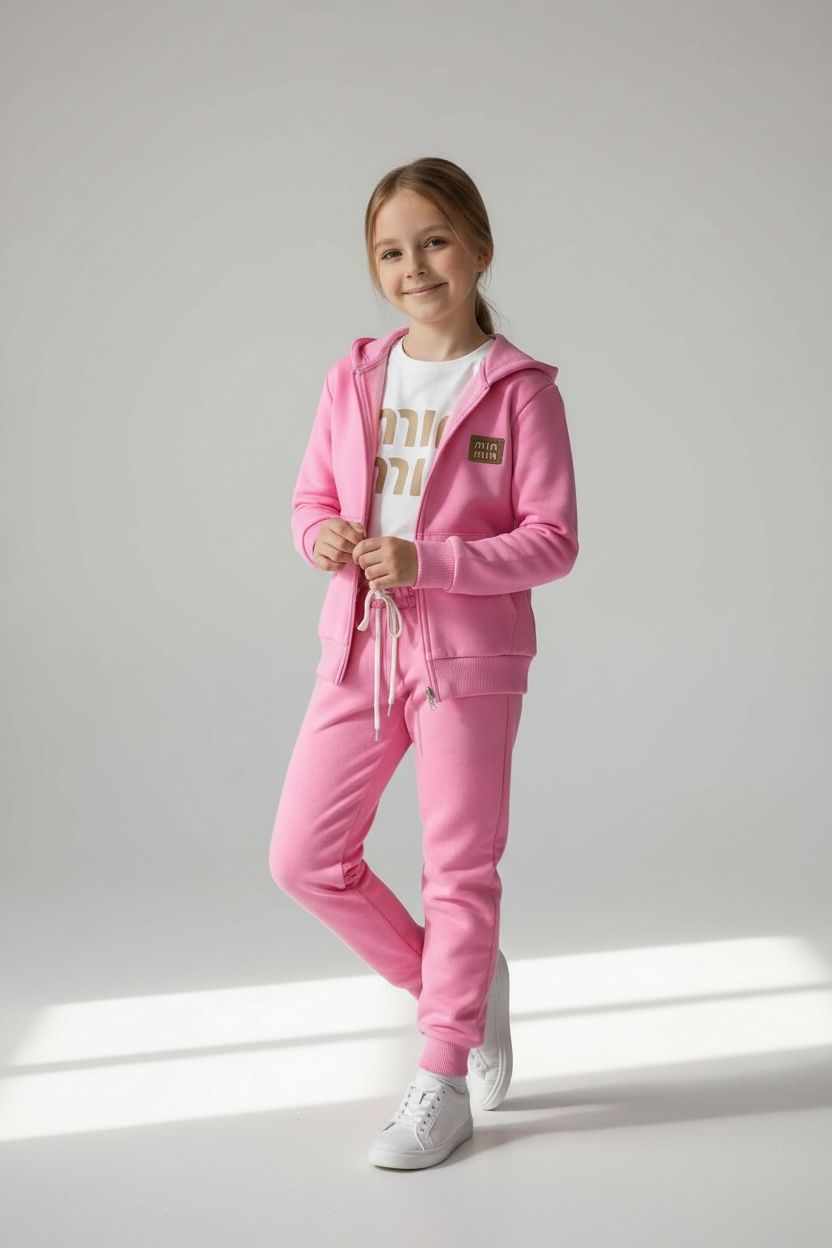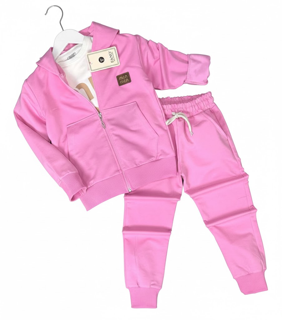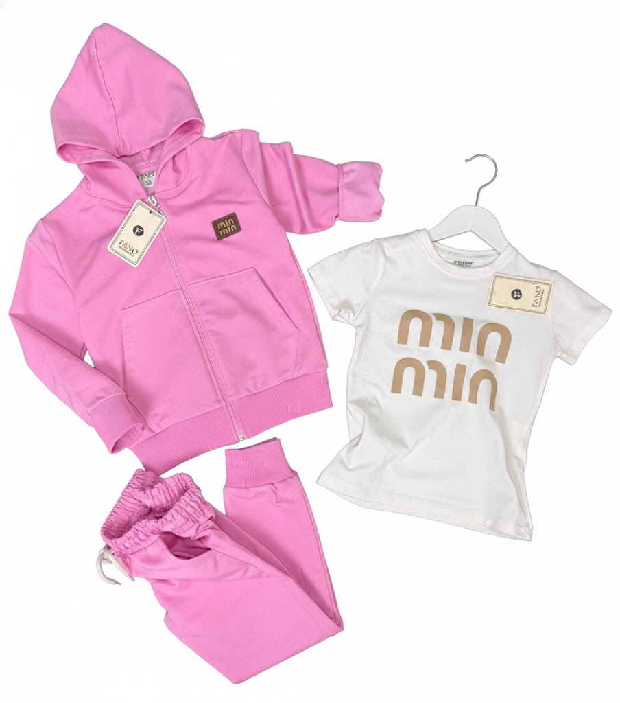 Bavlnený trojkomplet MIN MIN – ružový. Baseballová mikina s kapucňou má zapínanie na zips a male logo min min. Praktické biele tričko s nápisom min min. Ružové tepláky dokonale ladia s bundou. Tepláky majú vrecká pás na gumu a šnúrku, spodok teplákov je ukončený patentom.