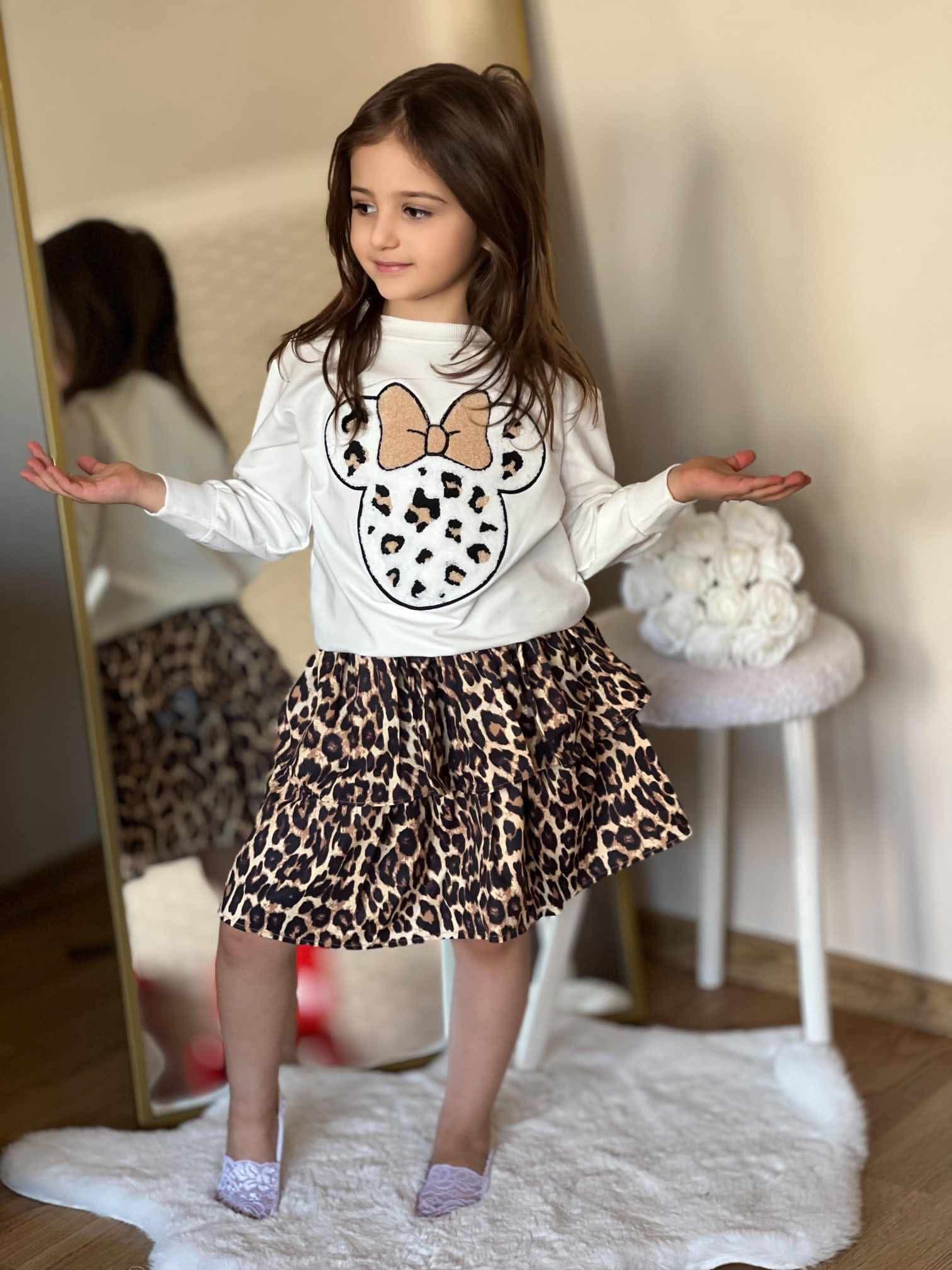 Štýlový dievčenský komplet vyrobený z kvalitného materiálu. Skladá sa zo štýloveho nátelníka s volánikmi a potlačou a krásnej leo sukničky.