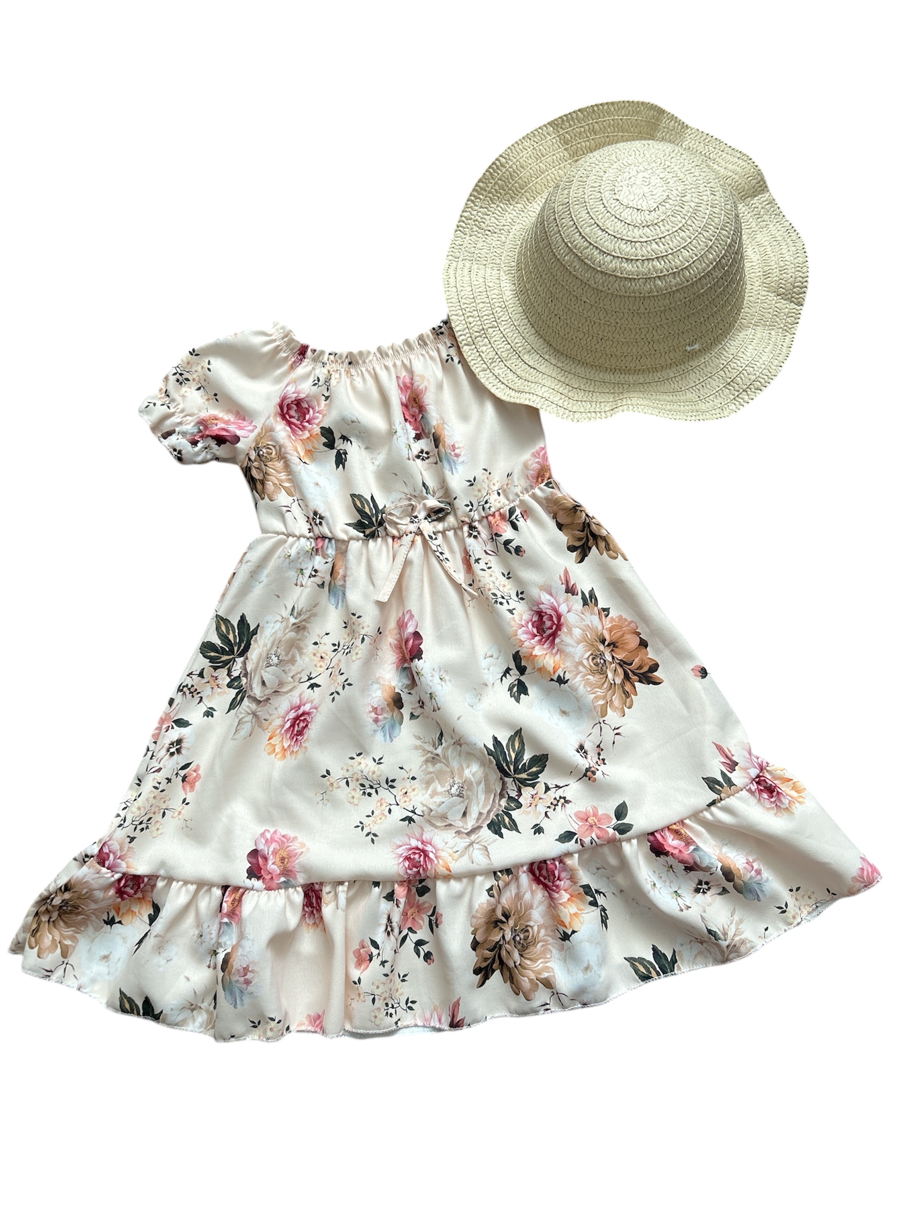 Štýlové dievčenské ľahučké letné šaty so slameným klobúkom. Šatičky sú vyrobené z kvalitného nekrčivého materiálu, pod prsiami majú gumičku a pekne sa prispôsobia. Skvelý letný kúsok pre Vašu malú parádnicu.