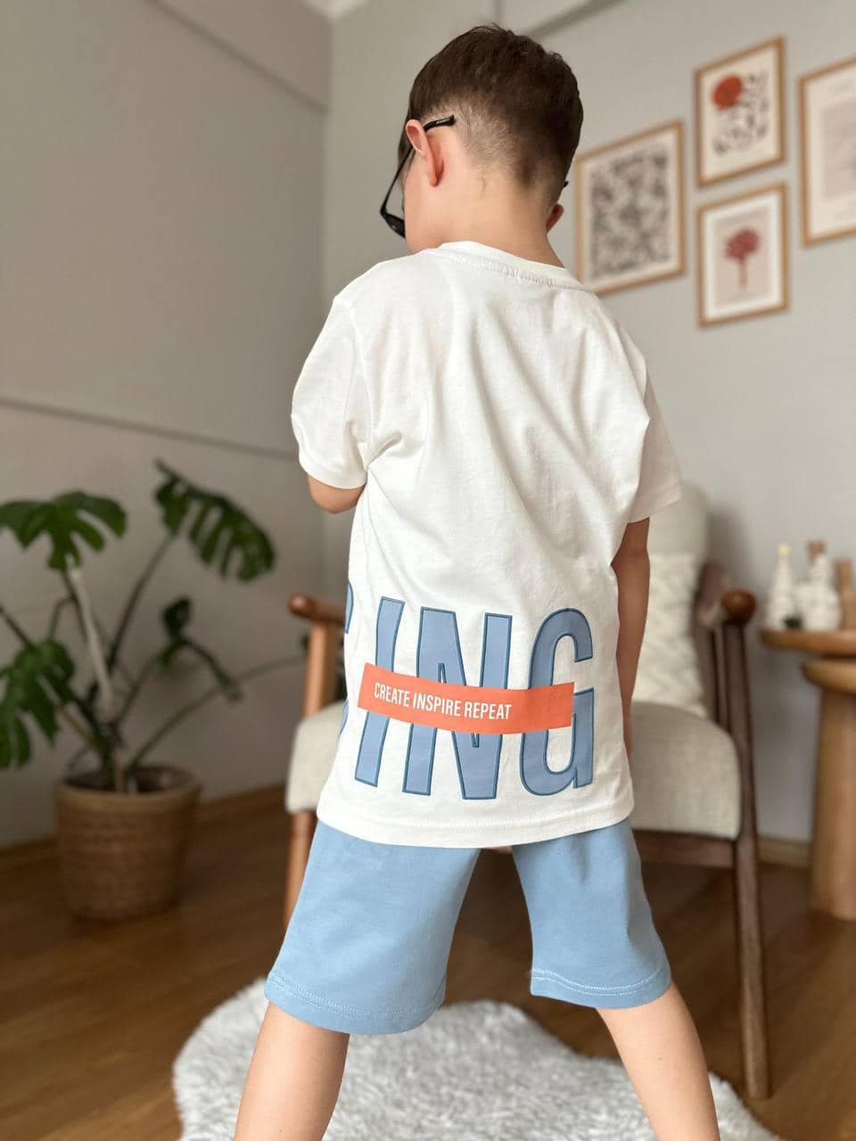 Štýlová letná chlapčenská bavlnená súprava. Skladá sa z trička s 3D nápisom DESIGN presahujúcim až na zadnú stranu a krátkych teplákov s vreckami vyrobených z kvalitnej bavlny doplnené štýlovou potlačou.
