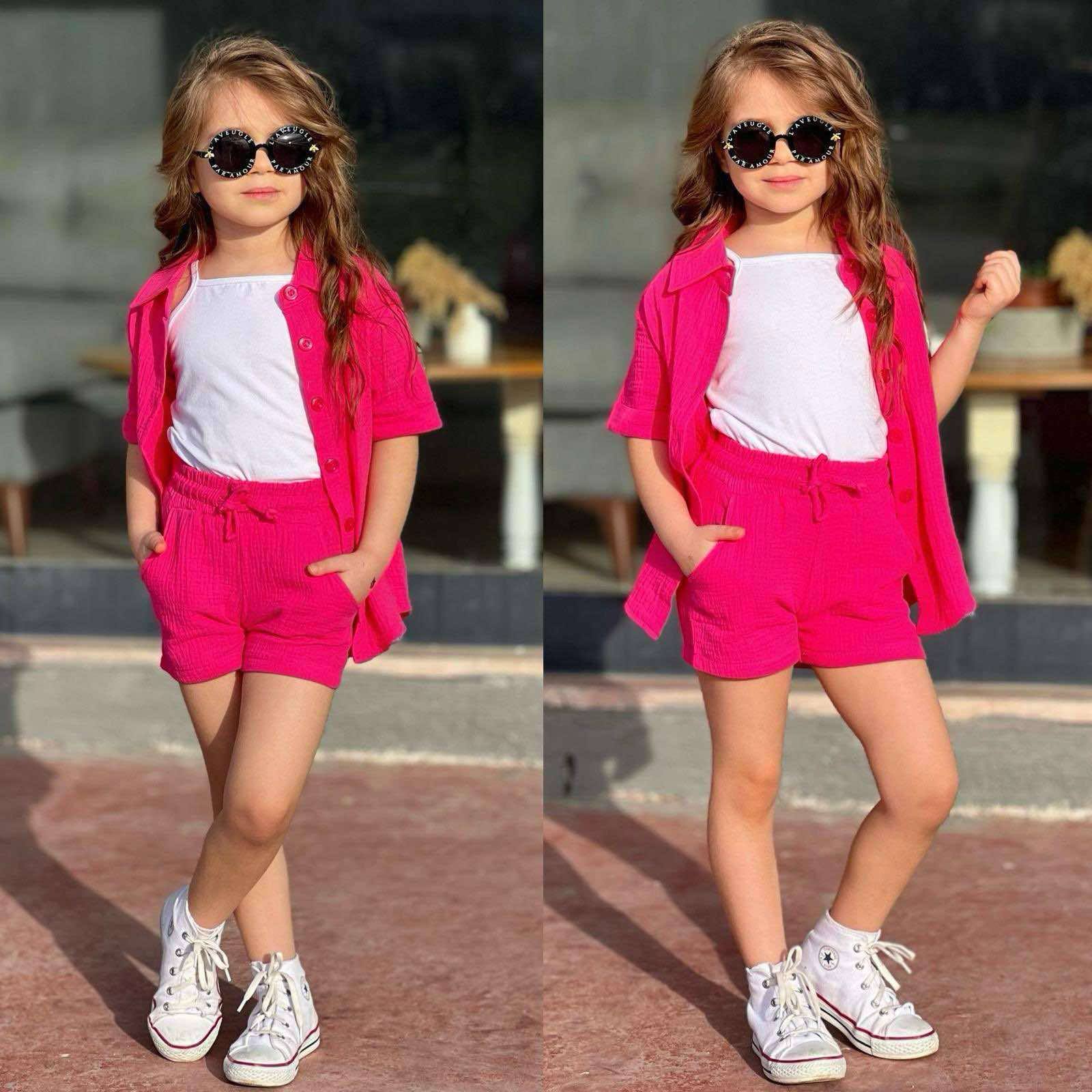 Kvalitný mušelínový trojkomplet, ktorý sa skladá z košele, tielka na ramienkach a kraťasov. Košeľa má zapínanie na gombičky, jednoduché biele tielko na ramienkach a kraťasy majú pás na gumičku aj na šnúrky. Kraťasy majú aj vrecká. Je to skvelý kúsok na leto a dovolenky.