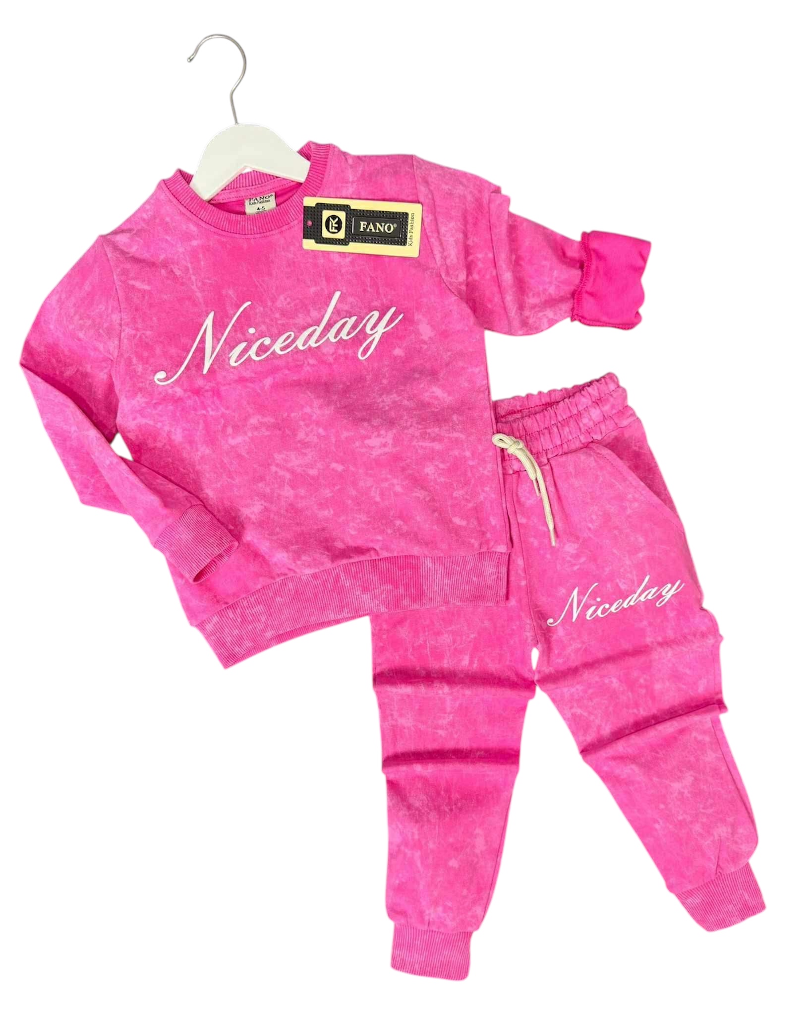 Štýlový komplet vyrobený z na dotyk príjemnej a kvalitnej bavlny. Komplet sa skladá z mikiny s nápisom NICEDAY a krásnych teplákov s nápisom, ktoré sú ukončené patentom. Tepláky majú pas na gumičku aj šnúrku, takže sa dajú pekne regulovať.