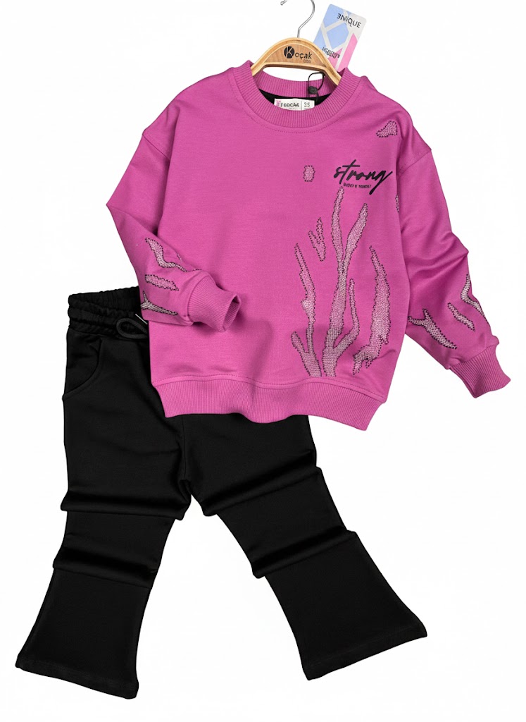 Tepláková súprava STRONG – cyklamen . Súprava je z kvalitného a príjemného materiálu, mikina v štýle oversize s kamienkovým vzorom aj na rukávoch, nápisom STRONG a zvonové tepláky s elastickým pásom a šnúrkou ponúkajú maximálnu voľnosť pohybu, ktoré sú momentálne veľmi trendy.