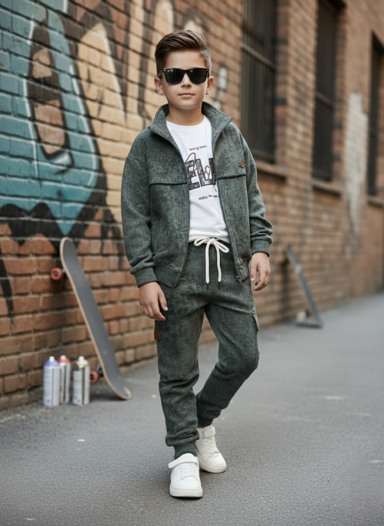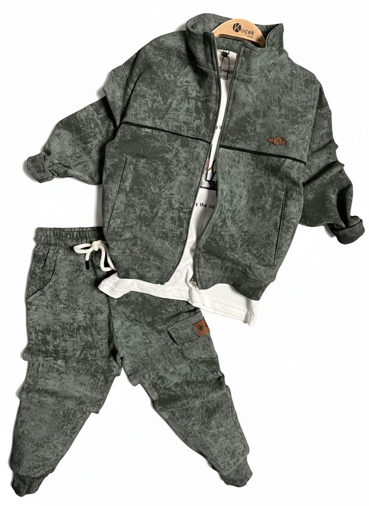 Predstavujeme vám chlapčenský 3-komplet RELAX v podmanivom olivovom odtieni, ktorý je hitom tohtoročnej sezóny. Tento set spája funkčnosť cargo štýlu s modernou estetikou, čím vytvára dokonalý outfit pre každého mladého muža, ktorý chce spojiť pohodlie domova s dravým mestským lookom.