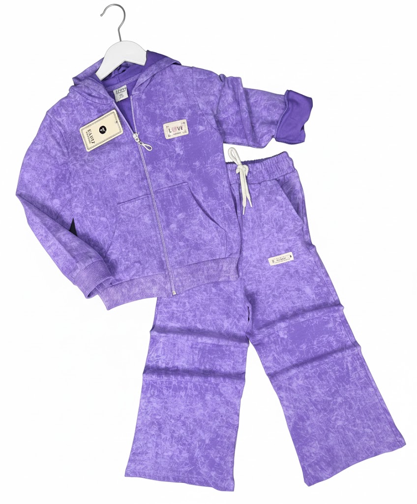 Táto dievčenská tepláková súprava nie je len obyčajným kúskom oblečenia, je to vyjadrenie štýlu a osobnosti. Dominantná fialová farba prechádza unikátnou úpravou batikovania (tzv. acid wash), čo znamená, že každý jeden kus je originál s neopakovateľným vzorom. Moderný “vintidž” vzhľad v kombinácii s trendy fialovým odtieňom robí z tohto kompletu kúsok, ktorý bude vyčnievať v každom detskom šatníku.