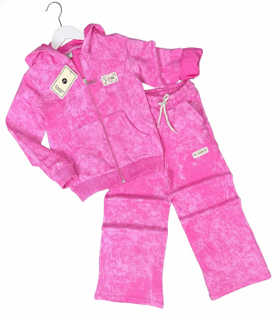 Hľadáte moderné dievčenské oblečenie? Bavlnený 2-dielny komplet v žiarivej ružovej farbe s trendy batikovaným vzorom. Set obsahuje mikinu na zips, pohodlné široké tepláky a biele tričko. Ideálny outfit do školy aj na voľný čas!