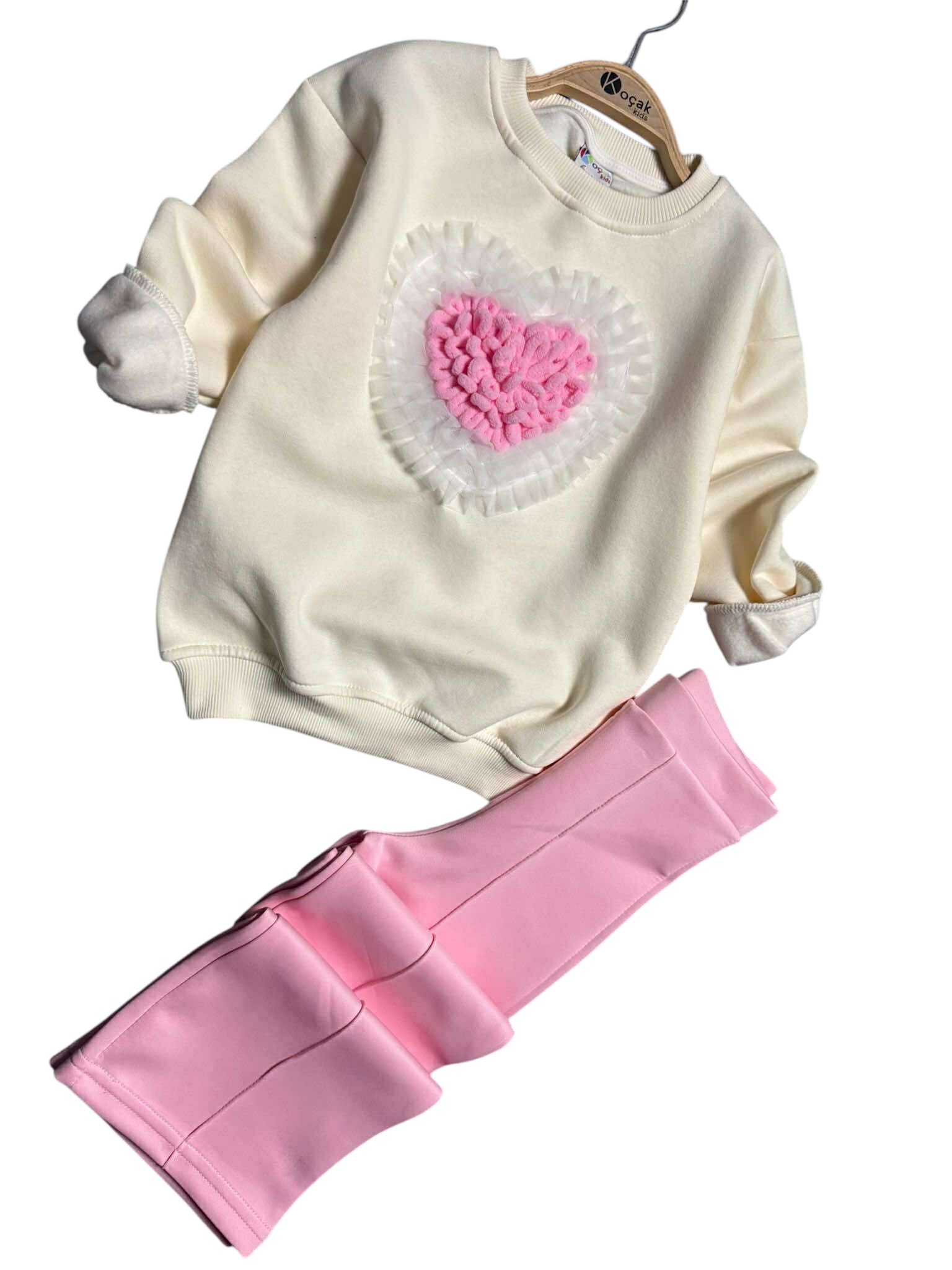 Zateplená bavlnená tepláková súprava KNITTED HEART vyrobená na dotyk z príjemnej a kvalitnej bavlny. Komplet sa skladá z mikiny s 3d srdiečkom a krásnych nezateplených zvonových legín, cez ktoré je spravene prešitie. Zvonové legíny majú pas na gumičku.